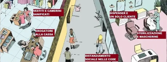 Si ragiona su 40 metri quadrati di superficie per definire quanti clienti potranno essere presenti nei negozi. Al di sotto di questa metratura l’ipotesi è che possa entrare uno alla volta. Per quelli molto più grandi basterà differenziare le entrate dalle uscite.