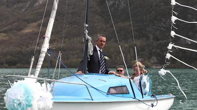TRASAGHIS. Il primo “sì” per una vita insieme sul lago di Cavazzo. È' stato celebrato sabato il primo matrimonio nella sede di Nautilago, sulla riva ovest del lago. I protagonisti dell’evento sono Marjsol Fumuso e Stefano Calligaro, residenti nella zona di Gemona, che hanno scelto proprio quel suggestivo paesaggio naturale per diventare marito e moglie. La celebrazione si è caratterizzata dall’arrivo della sposa in barca a vela: Marjsol ha raggiunto lo sposo nella sede di Nautilago, mentre sullo sfondo risuonavano le note di Strauss. Si è trattato di un matrimonio celebrato con rito civile dal sindaco Augusto Picco. I due sposi hanno scelto il luogo dove si sono conosciuti un anno prima: lui nella veste di istruttore di vela, lei come allieva. Per il Comune di Trasaghis si tratta del primo caso di matrimonio dopo che alcuni mesi fa la giunta Picco aveva deliberato la possibilità di celebrare i matrimoni nella sede di Nautilago, facendo riferimento alle normative che permettono di celebrare il rito anche fuori dalla sede istituzionale del municipio purché i locali utilizzati siano di proprietà comunale come è di fatto la sede utilizzata dai praticanti la vela.