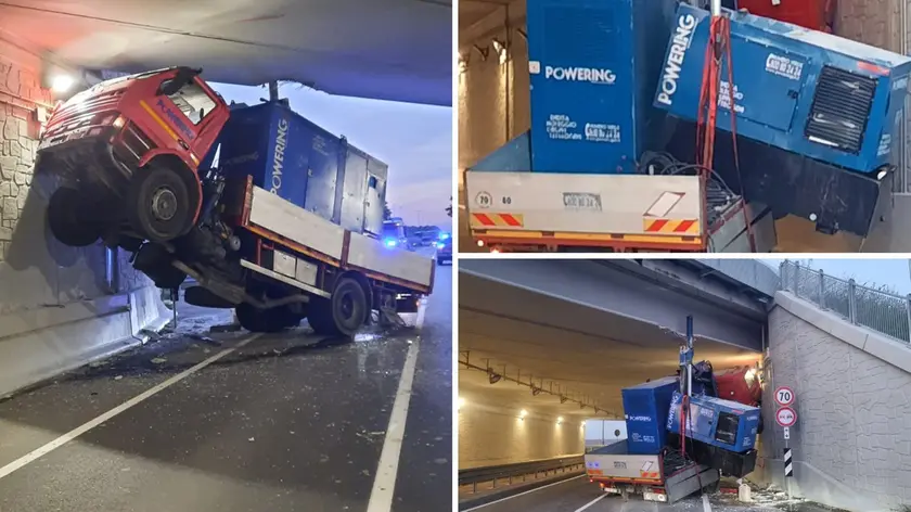 Si incaglia la gru nel cavalcavia e il camion si impenna: illeso il conducente
