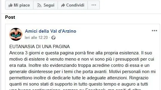 Ad annunciarlo, ovviamente e non potrebbe essere altrimenti, con un post piuttosto lapidario è stato domenica scorsa lo stesso ideatore e amministratore Maurizio Peresson, comunicando l’”eutanasia” della pagina. «Ancora tre giorni e questa pagina porrà fine alla propria esistenza – ha scritto –. Il suo motivo di esistere è venuto meno e non vi sono più i presupposti per cui era nata. Inoltre sto evidenziando troppa acredine contro di essa e un generale disinteresse per i temi che porta avanti. Motivi personali non mi permettono inoltre di dedicarle tutte le adeguate attenzioni.