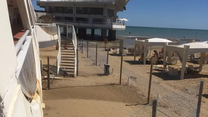 A piantonare la zona ci sono i pali in legno e c’è la rete celeste riutilizzati da quello che inizialmente, come suggerito da PromoTurismoFvg, sarebbe dovuto essere il perimetro che avrebbe separato il lungomare dal litorale evidenziando gli accessi agli uffici spiaggia, di modo da facilitare il conteggio e la profilazione dei bagnanti (utile all’eventuale ricostruzione dei contatti in caso di un episodio di contagio da coronavirus).