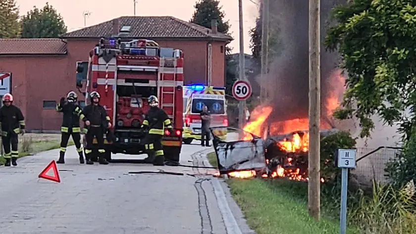 Auto esce di strada e prende fuoco: fiamme e fumo a Pasiano di Pordenone | Il video