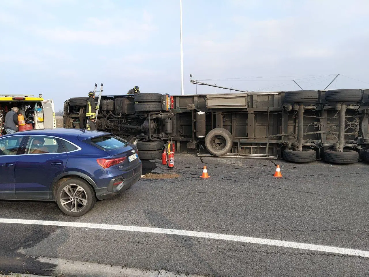 Il carico fuoriuscito dal camion ribaltatosi a Codroipo