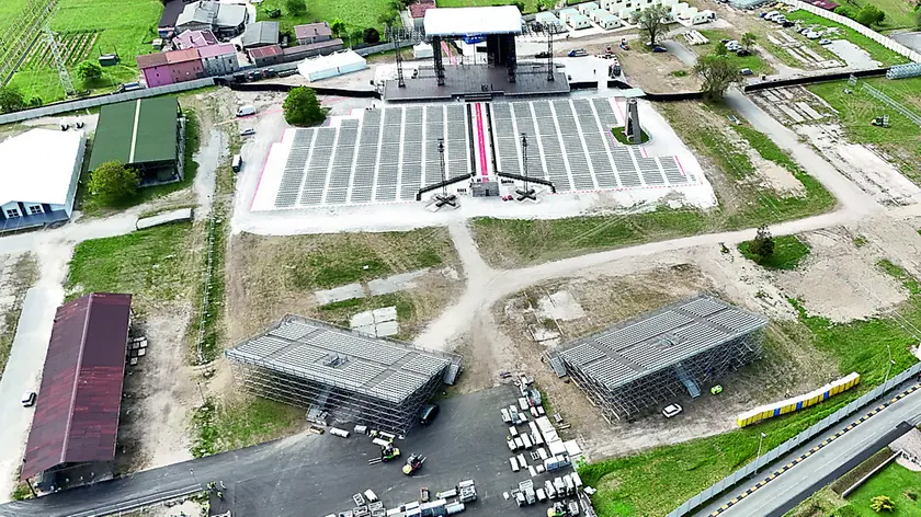 Una veduta aerea del palco e delle tribune alla caserma Goi-Pantanali di Gemona (foto Petrussi)