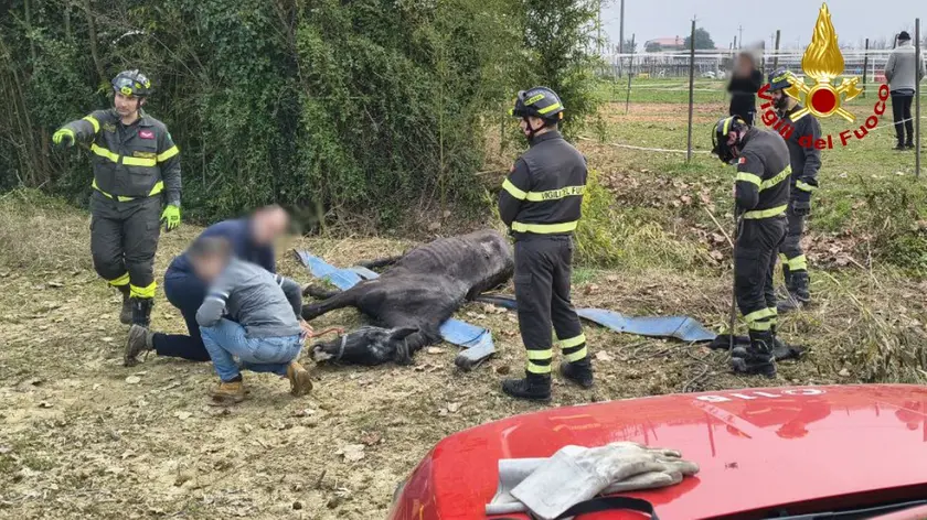 L’incidente si è verificato a Pasiano di Pordenone. L’animale non riusciva a liberarsi, visibilmente stremato: i pompieri lo hanno recuperato utilizzando il verriccello di un mezzo fuoristrada