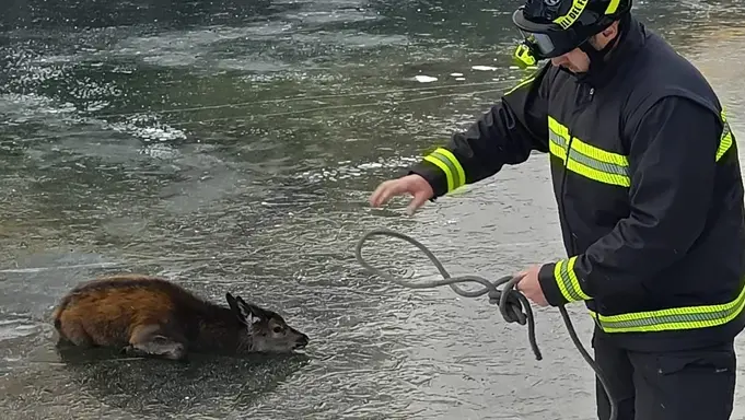 Giovane cervo intrappolato nel lago ghiacciato: preso al lazo e salvato dai pompieri
