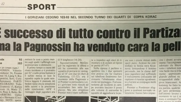 Acqua o vino, poco importa: Premier continua a martellare il canestro del Partizan, tanto che l’avversario diretto Arsenije Pesic – che negli Anni 80 divenne per qualche mese divenne uno degli stranieri della Segafredo – pensa bene di rifilargli un calcione per bloccarlo. Espulsione. E perfetta partità, a quota 47, alla fine del primo tempo. E anche dopo 40 minuti: 85-85. Ci volle un supplementare per decretare la vincente di quella epica euro-sfida: il Partizan che sfrutta la stanchezza di Premier e Pondexter, senza grandi alternative nelle strategie di Jim McGregor, viste le condizioni imperfette di Rino Bruni. Finisce 93-103, un risultato che lancia in orbita i bianconeri di Belgrado, capaci poi di vincere il gironcino di qualificazione e soprattutto la Coppa Korac in finale con Rieti. Dopo aver chiesto il permesso alla piccola-grande Gorizia. Che tempi!