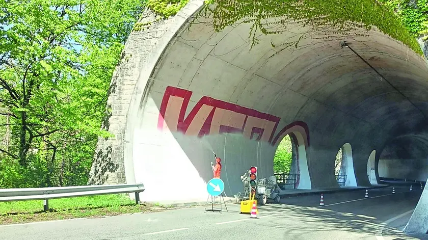 Gli operai impegnati nella pulizia delle superfici imbrattate all’interno della galleria Maniaglia - Gemona centro