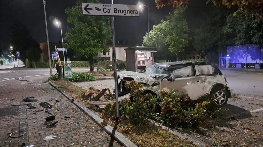 Brugnera, vettura distrutta. Ha finito la sua corsa contro il palo di un cartello
