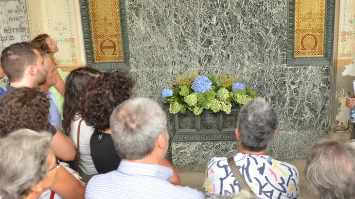 Il gruppo fa poi tappa davanti alla lapide di Elena Morpurgo in Rubini, figlia di Elio Morpurgo. Quest’ultimo venne deportato nei campi di concentramento nel 1944, a 84 anni. Poco più avanti, nella parte ebraica del cimitero, è possibile vedere un cenotaffio, una tomba vuota in suo ricordo. La figlia Elena, invece, scelse di essere sepolta nella parte cristiana del cimitero, vicino al marito. Ma il momento più significativo di questo appuntamento con il Genius Loci è davanti alla tomba di Arturo Malignani: semplice, circondata da un cancello in ferro nero e fiori rossi al centro. Qui i lettori ascoltano la storia di questo grande uomo friulano, imprenditore e inventore che segnò la svolta nello sviluppo dell’energia elettrica, vendendo a Edison il brevetto per la lampadina. La visita dei lettori finisce in un luogo significativo, davanti alla sepoltura di Raimondo D’Aronco. Qui il cuore fa quasi un saltello: poco prima della struttura, un magnifico esempio di stile Liberty, ci sono due transenne che delimitano lo spazio. Pericolosa, lasciata all’incuria. Lì dove riposa l’architetto ora ci sono le erbacce che si insinuano tra i mattoni. Un’immagine che parla di morte molto più delle tombe che la circondano. Un’immagine che Presani non avrebbe mai voluto all’interno della sua opera. Ma che, forse, in qualche modo aveva previsto quando nei suoi appunti scrisse: «Sono molti che si contentano di osservare la parte materiale, pochi si curano di entrare nella ragione dell’arte e di consacrare qualche momento alla riflessione».