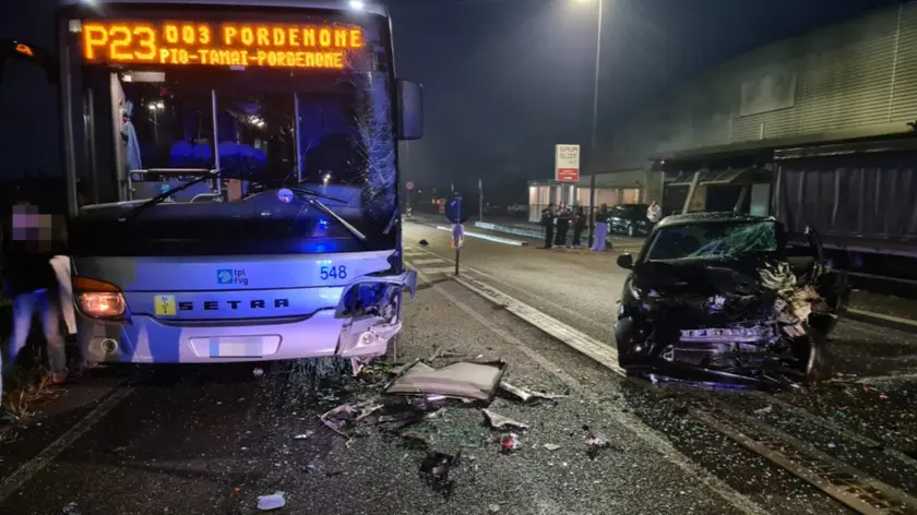 Ferita solo la conducente del veicolo, 25 anni. L’incidente in prossimità di una rotonda. Il bus era diretto a Pordenone
