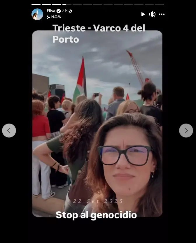 Tra i manifestanti c’era anche la cantante monfalconese Elisa, che ha condiviso molte Stories sui suoi canali social direttamente dal presidio ribadendo a più riprese “Stop al genocidio”.