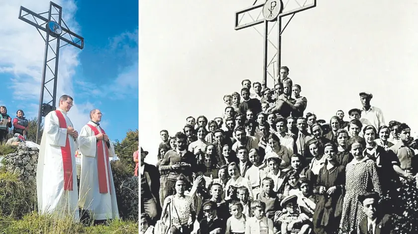 La celebrazione di un anniversario della posa della croce e, a destra, uno scatto storico dei partecipanti a una cerimonia accanto all’opera in ferro battuto sulla cima del monte Jouf