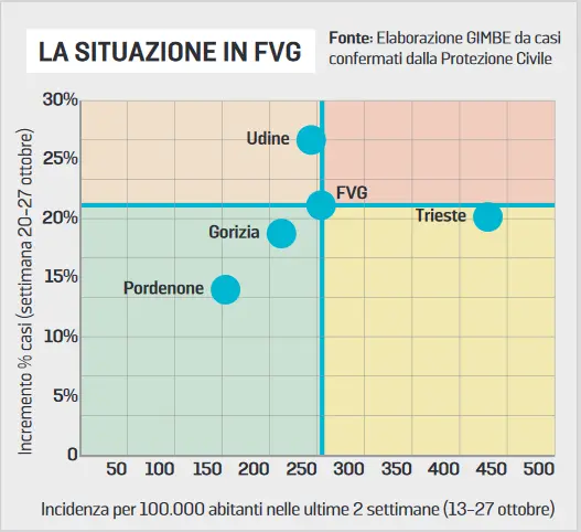 I grafici Gimbe. Dopo mesi in cui il Fvg era rimasto fra le regioni meno colpite dalla pandemia - almeno secondo i parametri della Fondazione Gimbe – , da qualche tempo si ritrova in una posizione meno favorevole. Dal quadrante “verde”, il Fvg è ora al confine di quello “arancione”, dove l’incremento percentuale dei casi è superiore alla media nazionale.
