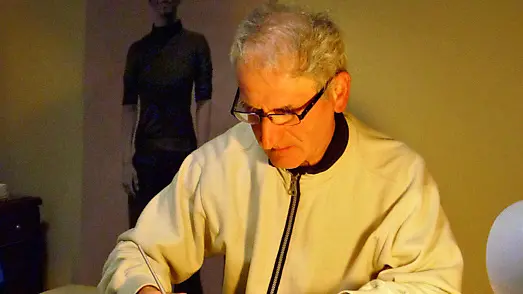 Ennio Malisan mentre lavora a un disegno con il pennino in mano
