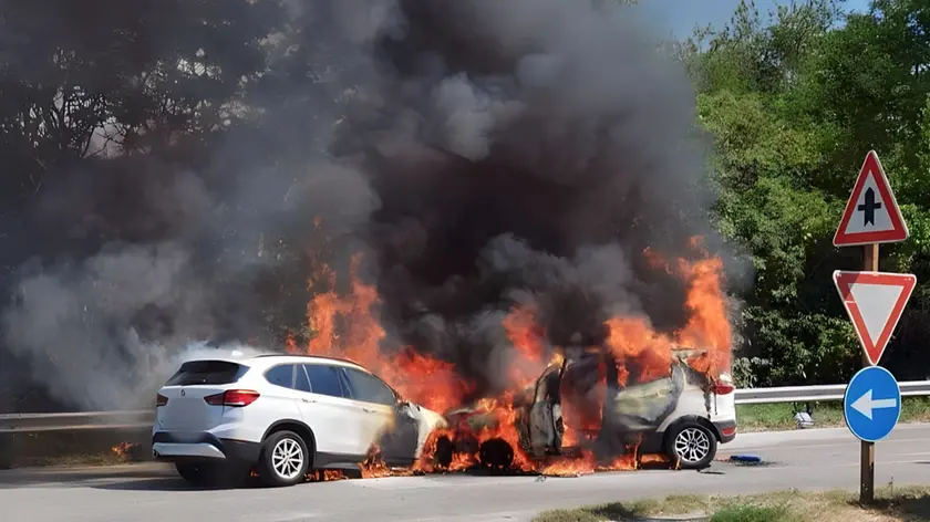 Due auto prendono fuoco dopo uno scontro frontale a Sistiana: strada chiusa al traffico