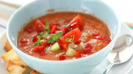 Intanto vediamo cos’è: nella cucina spagnola il gazpacho è una zuppa fredda a base di verdure crude, molto apprezzata d'estate in regioni come l'Andalusia. Gli ingredienti principali sono tradizionalmente peperoni, pomodori, cetrioli e cipolla, arricchiti di volta in volta con erbe aromatiche differenti, e pane raffermo ammorbidito in acqua, che rende cremoso il composto. Il piatto si mangia comunque fresco, talvolta con crostini di pane con uova sode su una ciotola di terracotta, poiché questa trattiene meglio i sapori. Viene anche usato come aperitivo servito in bicchiere, come energetico.