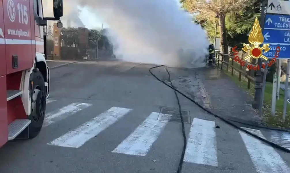 Il veicolo stava percorrendo la Strada del Belvedere, a Moruzzo, quando ha preso fuoco: il conducente ha fatto appena in tempo a parcheggiare e uscire dall’abitacolo. intervenuti i vigili del fuoco