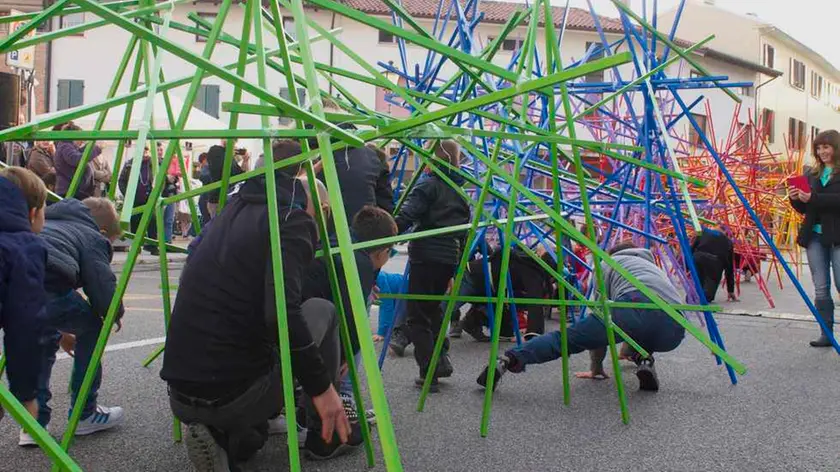 I cinque performer hanno guidato gli spettatori nella costruzione di un'originale scena fatta di bacchette colorate, poi diventata spazio di gioco. Ognuno era invitato ad attraversare il percorso senza toccare le bacchette.