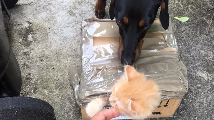 Fiuta la scatola e “avvisa” i padroni: il cane salva il gattino abbandonato