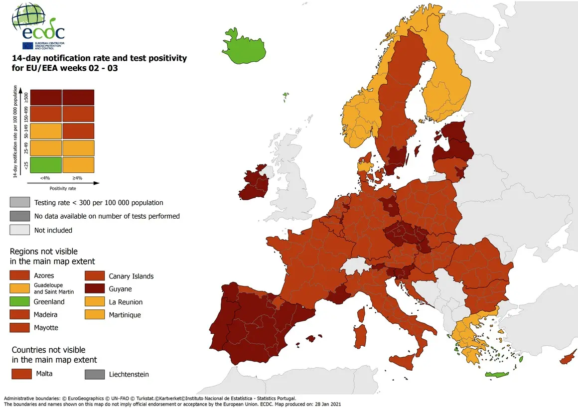 La mappa dell’Ecdc si basa su dati comunicati dagli Stati membri dell'Ue al database del sistema europeo di sorveglianza (Tessy) entro le 23.59 di ogni martedì. Sul sito dell’Ecdc si legge che la mappa è pubblicata “a sostegno della raccomandazione del Consiglio su un approccio coordinato alla restrizione della libera circolazione in risposta alla pandemia Covid-19, adottata dagli Stati membri dell’Ue il 13 ottobre 2020”.