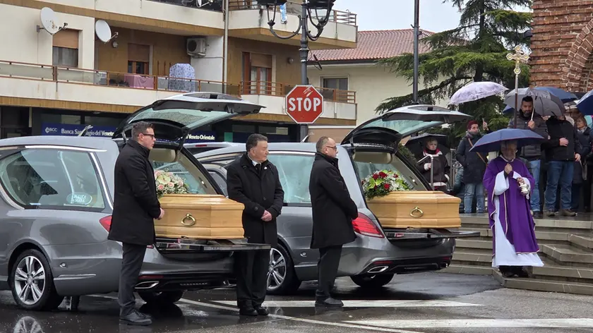 Una carezza lenta, quasi a voler fermare il tempo. Poi un’altra, sul secondo feretro. Così Alessio, uscito dall’ospedale per l’ultimo saluto, ha salutato per l’ultima volta il padre Luigi Codotto e la madre Luigia Rossi, nella chiesa gremita di Pertegada. Uno sguardo ai piccoli mazzi di fiori bianchi e rossi appoggiati sulle bare, qualche parola sussurrata, poi il silenzio. Attorno a lui e alle sorelle Susanna ed Elisa si è stretta l’intera comunità, in un abbraccio composto e rispettoso.