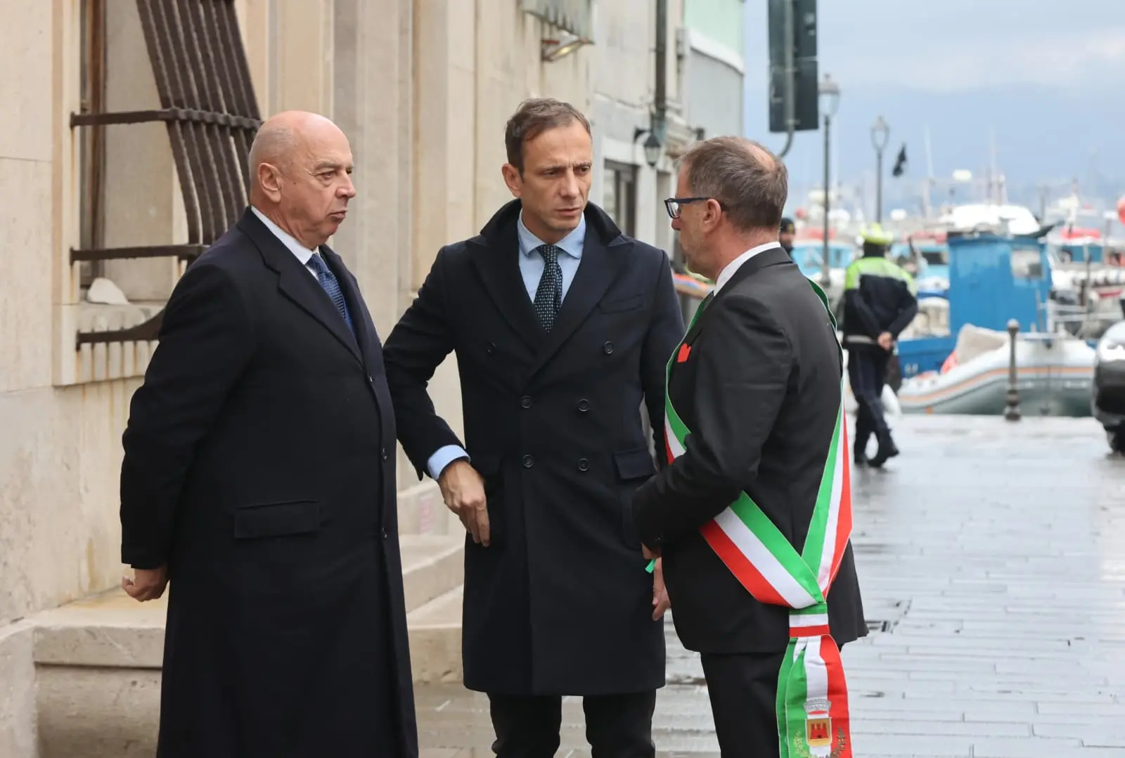 Il sindaco di Muggia Polidori con la fascia trciolore presente insieme al primo cittadino di Trieste, Dipiazza e al presidente della regione Fedriga