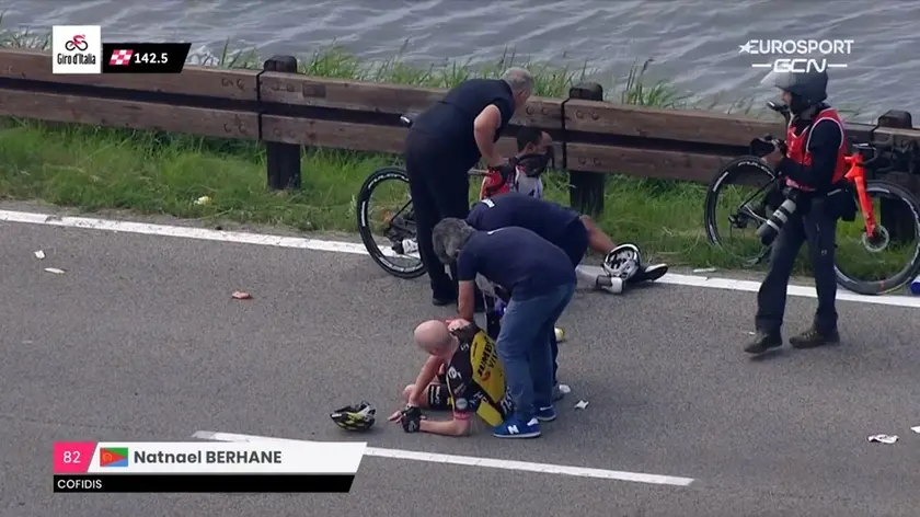 Tra i coinvolti Emanuel Buchmann (Bora Hangrohe) , sesto in classifica a 2’36” dalla maglia rosa, e Jos Van Emden (Jumbo) che hanno dovuto abbandonare la corsa