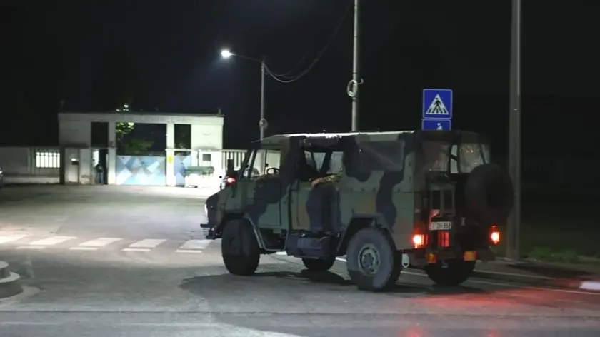 L'arrivo di una camionetta dell'esercito all'ex caserma Cavarzerani nella serata di lunedì 17 luglio (foto Petrussi)