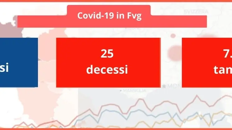 Le persone risultate positive al virus in regione dall'inizio della pandemia ammontano in tutto a 23.983, di cui: 6.077 a Trieste, 10.054 a Udine, 4.638 a Pordenone e 2.905 a Gorizia, alle quali si aggiungono 309 persone da fuori regione.