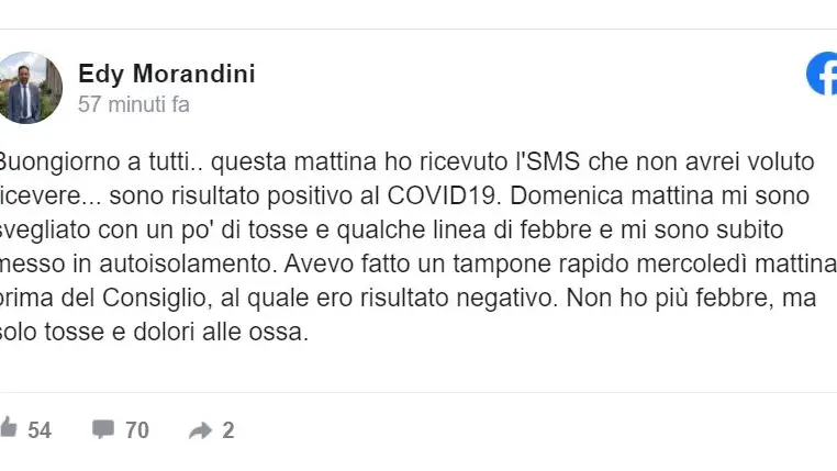 Morandini ha aggiunto di stare bene, ora, di non avere più febbre, ma solo un po’ di tosse e qualche dolore alle ossa. Mercoledì mattina, prima di partecipare al Consiglio regionale, – ha precisato Morandini - aveva fatto un tampone rapido al quale era risultato negativo.