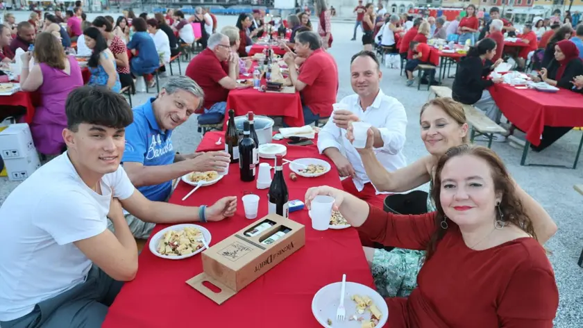 Cinquecento persone, che, sui tavoli e sedie rivestiti da tovaglie color amaranto, colore simbolo di Palmanova, hanno cenato sotto il cielo stellato nella piazza d’armi simbolo della Fortezza.