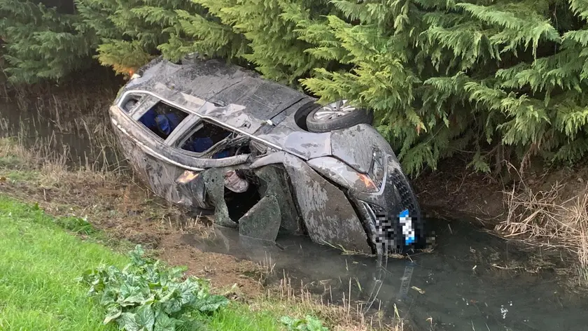 Auto con sette persone a bordo esce di strada e si cappotta nel canale
