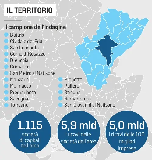 Presentato lo studio di ItalyPost sulle migliori 100 aziende di 17 Comuni. Ricavi aggregati a quota 5 miliardi, ma l'Ebitda frena leggermente. Martedì il confronto tra imprenditori a Corno di Rosazzo