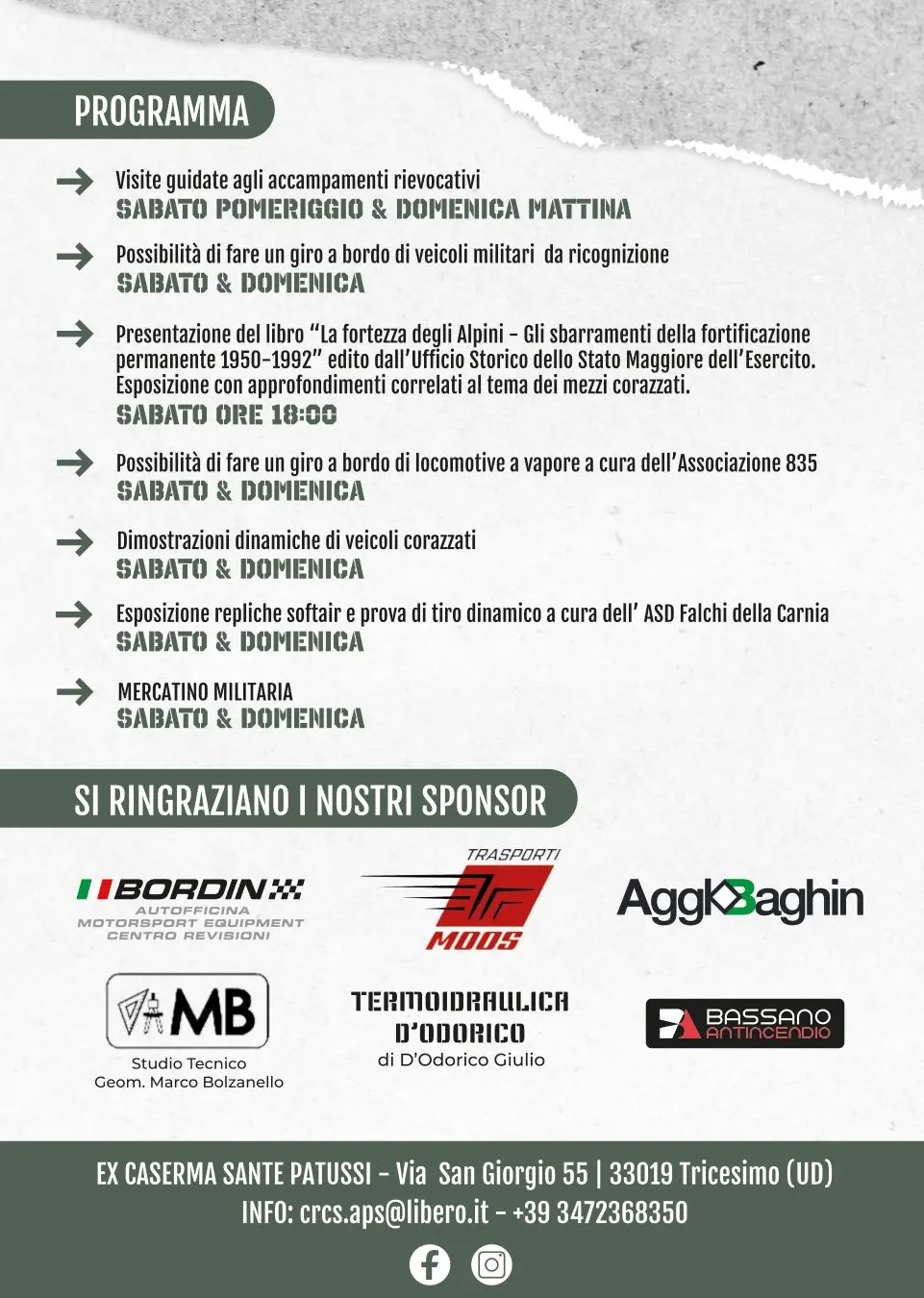 Durante i due giorni dell’evento verranno esposti e movimentati numerosi mezzi militari storici (jeep, moto, camion, cingolati, autoblinde e artiglierie) provenienti dalle diverse collezioni private dei soci dell'associazione e dell’Esercito, alla presenza di numerosi rievocatori del periodo Seconda Guerra mondiale, una esposizione di materiale di velivoli abbattuti in Friuli, modellistica militare e un mercatino di Militaria per gli appassionati del settore.