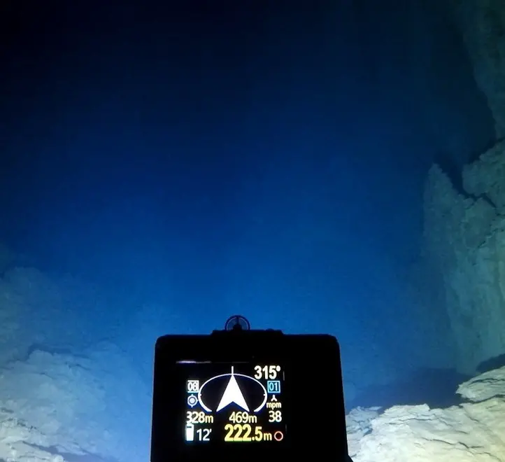 Affascina l’immagine che Starnawski ha postato sul suo profilo Facebook che ritrae il display del profondimetro, installato sul proprio scooter subacqueo, con la misura di – 222,5 metri, raggiunta da Krzysztof Starnawski dopo 15 minuti d’immersione, alle 11.24 di giovedì 5 settembre. Sui lati si vedono le rocce calcaree della voragine, davanti, illuminato, il blu intenso del mistero di un orrido che nessuno sa a quale profondità conduce.