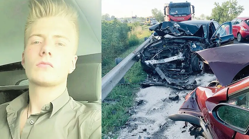 Nicholas Giordano, morto nel giorno del compleanno, l’8 settembre 2021. A destra, le due auto dopo lo scontro frontale sulla Osovana, tra Pagnacco e Feletto Umberto