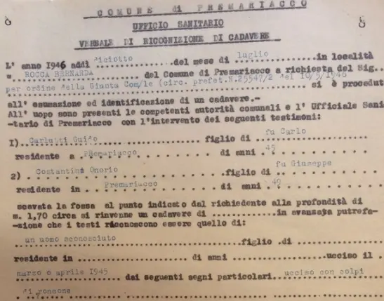 Nelle carte, infatti, erano spuntati non solo i nomi di 42 morti riesumati nel 1945, ma anche documenti che accusavano degli eccidi i partigiani. «Nel territorio di questo Comune – c’è scritto in una lettera indirizzata dal sindaco di allora – si trovano sparsi nella campagna e sepolte quasi a fior di terra le salme di circa 60 persone in parte sconosciute che furono uccise dai partigiani, perchè ritenute quali spie o collaboratori dei tedeschi»