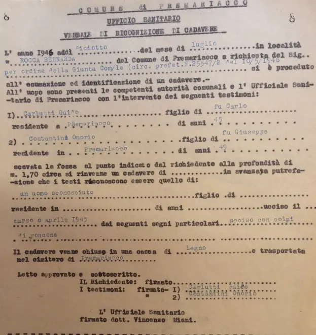 Inizia così il documento indirizzato alla Procura datato 19 maggio 1945. È solo una delle carte che fanno parte del faldone intitolato “Anpi, gioie e dolori” contenuto nel registro anagrafe del comune di Premariacco. Il fascicolo è stato acquisito a fine marzo dai carabinieri della compagnia di Palmanova e, ieri, reso noto dal presidente della Lega nazionale, Luca Urizio.