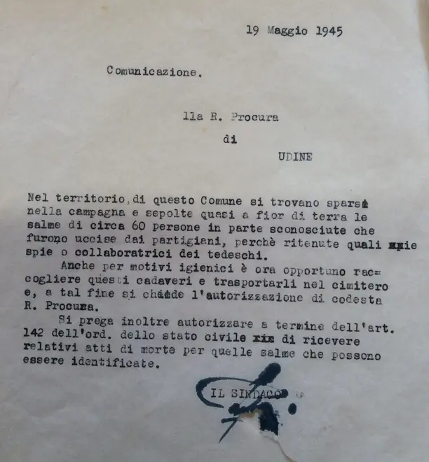 PREMARIACCO. «Nel territorio di questo Comune si trovano sparsi nella campagna e sepolte quasi a fior di terra le salme di circa 60 persone in parte sconosciute che furono uccise dai partigiani, perchè ritenute quali spie o collaboratori dei tedeschi».