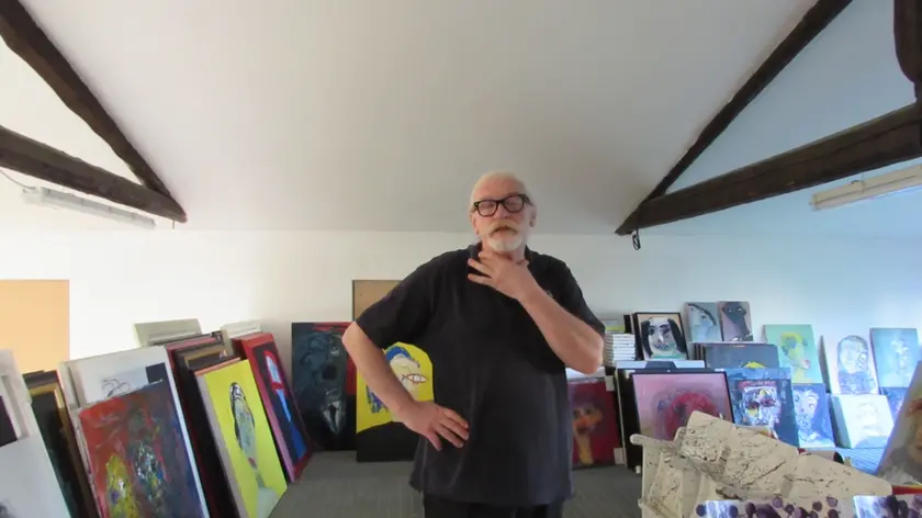 Da ieri, nella chiesa di Santa Maria dei Battuti a Cividale, l’oste-artista espone le sue ultime opere nella personale dal titolo “Dopodiché. Giordano Floreancig pittore?”. Affida la risposta ai suoi quadri, ai quali attribuisce vita e volontà. “Io sono mio” è il titolo di uno; “Ti aspetto tremando” un altro. Di loro dice: «Certi quadri non sono ancora finiti che vogliono andare al loro vernissage». E aggiunge: «La sera gli dò la buonanotte, la mattina il buongiorno e a Natale il panettone».