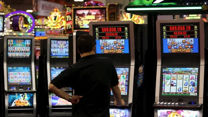 Un uomo gioca con una slot machine in una foto d'archivio. ANSA / YM YIK .