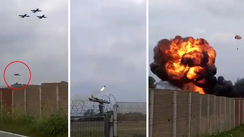 Tre fermi immagine del video che riprende il momento dello schianto dell'aereo delle Frecce Tricolori