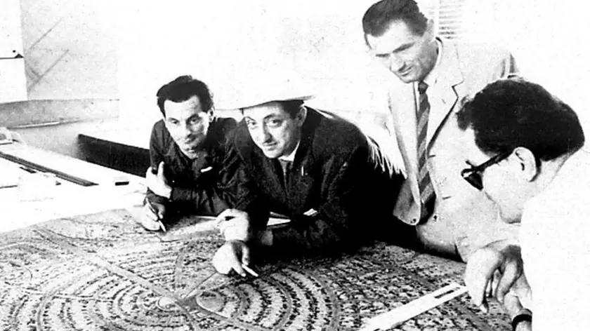 Nel 1954 D’Olivo conduce Sinisgalli a visitare il cantiere della nuova città «che sta sorgendo tra gli alberi e le acque», dove può ammirare l’insolita forma a spirale che rende Lignano Pineta un caso di rilevanza internazionale.