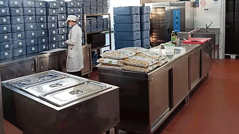 Cascone indica anche l’area dedicata alla confezione dei pasti per celiaci «Usiamo pentolame dedicato esclusivamente alla preparazione di pasti senza glutine: 172 diete speciali e una ventina di diete per celiaci». Una volta pronti, i pasti sono termosigillati e etichettati in vaschette compostabili sigillate con materiale compostabile. «Sono conservati all’interno di contenitori che mantengono la temperatura fino a 80° finché non sono serviti a scuola». La termosigillatrice era già in azione alle 8.30: si stavano confezionando le vaschette contenenti i bocconcini di tacchino che sono state servite a pranzo in alcune mense. L’attività a Ruda parte alle 4.20 di mattino.