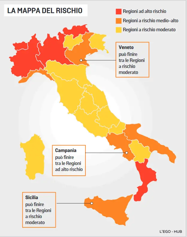 Chi ha un rischio complessivo alto e si trova nel temibile “scenario 4” è nella fascia rossa, che implica un lockdown di fatto, anche se “temperato”: con chiusura dei negozi, salvo quelli che vendono beni essenziali, divieto di spostamento non solo dalla regione e dal Comune, ma anche da casa se non per motivi di studio o di lavoro. In fascia rossa Lombardia, Piemonte, Calabria e anche Bolzano e Valle d’Aosta.