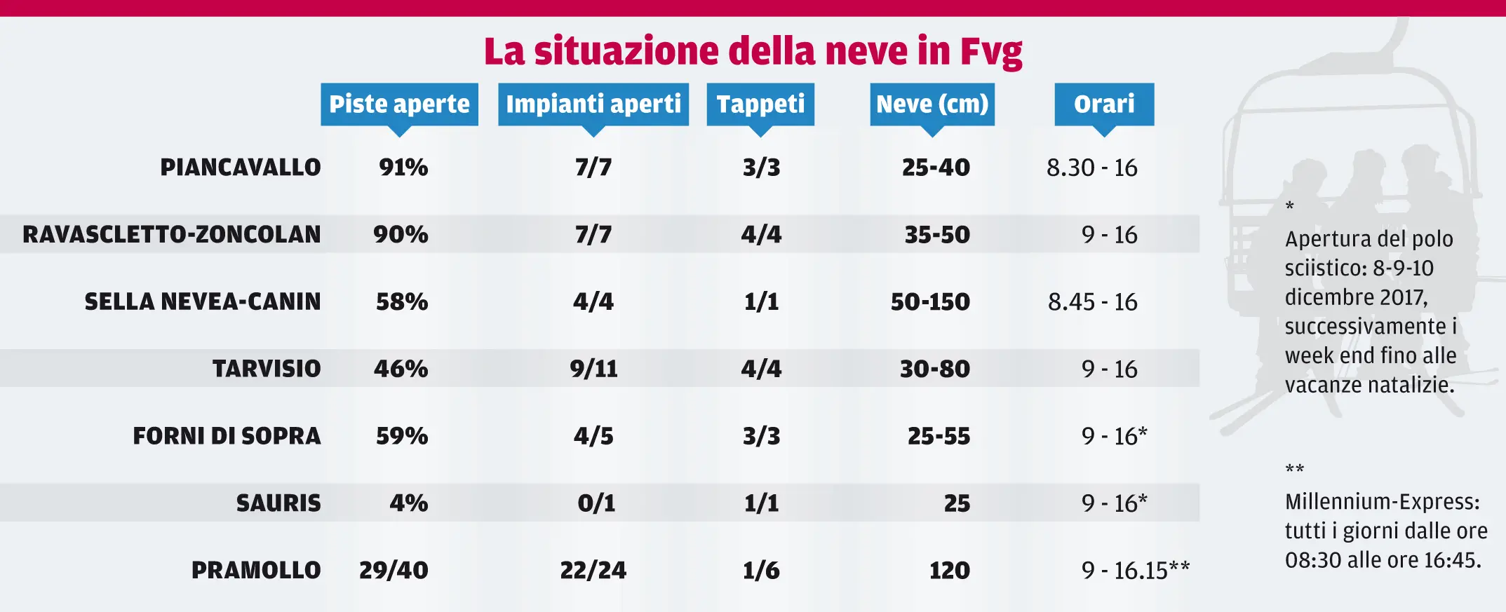 Infine, se a Sauris è aperto solo il campo scuola – 4 per cento delle piste, 1 tappeto, zero impianti su 2 –, a Forni di Sopra la copertura percentuale delle piste aperte è arrivata al 59 per cento, la neve in pista da 22 a 55 centimetri. Si scia sul Varmost (esclusa la variante 2), sulle piste Senas e Davost. A Sauris e Forni di Sopra le piste chiuderanno da domani al 15 dicembre per poi riaprire nel weekend a differenza degli altri poli che con l’8 dicembre saranno aperti in via continuativa fino a fine stagione fissata per il 25 aprile a Sella Nevea per il 2 dello stesso mese negli altri poli.