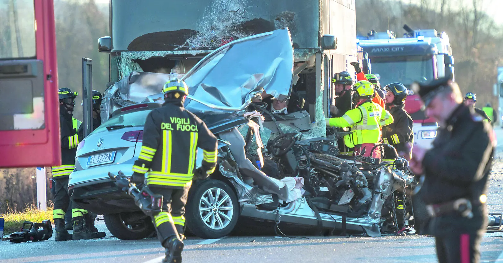 Schiacciata nella collisione, la vettura è stata trascinata dal bus, arrestandosi, ormai disintegrata, nel punto dove sono cominciate le operazioni di soccorso. Non si esclude che a complicare in maniera irrimediabile il sorpasso sia stato anche un abbaglio di sole negli occhi del conducente, ma solo ulteriori indagini potranno accertarlo.