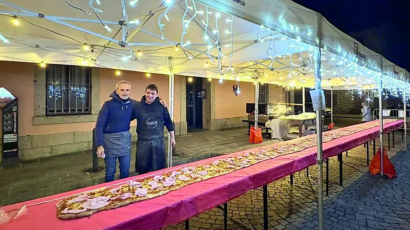 Non senza difficoltà la preparazione. «Non ho potuto infornare i 10 metri in un’unica volta – racconta Mazzurco –. Per farla tutta ci abbiamo messo all’incirca due ore, lavorando al freddo perché ho dovuto usare un forno elettrico all’esterno. Ho fatto più panetti mettendoli vicini tra loro una volta cotti. Al momento del servizio abbiamo finito di condirla e l’abbiamo scaldata, in totale circa 300 tranci. Sono rimasti tutti contenti, è stato un bel momento conviviale». La pizza, completamente esaurita, è stata realizzata con una base di farina di nocciole, mortadella, fior di latte e formaggio salato della latteria Caseum di Usago.