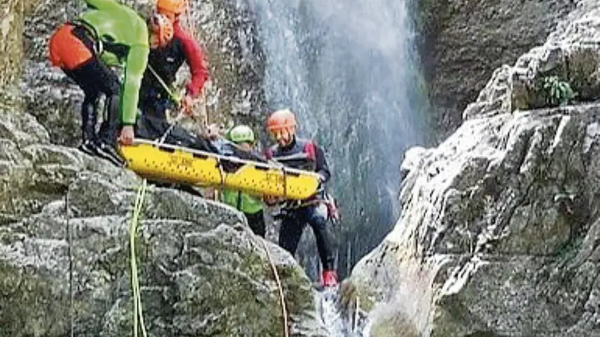Il soccorso alpino e speleologico interviene in ogni stagione e in qualsiasi luogo: mare, montagna, fiumi, grotte, pareti rocciose, valanghe e, come in questa immagine, nei salti dei torrenti molto presenti anche in regione